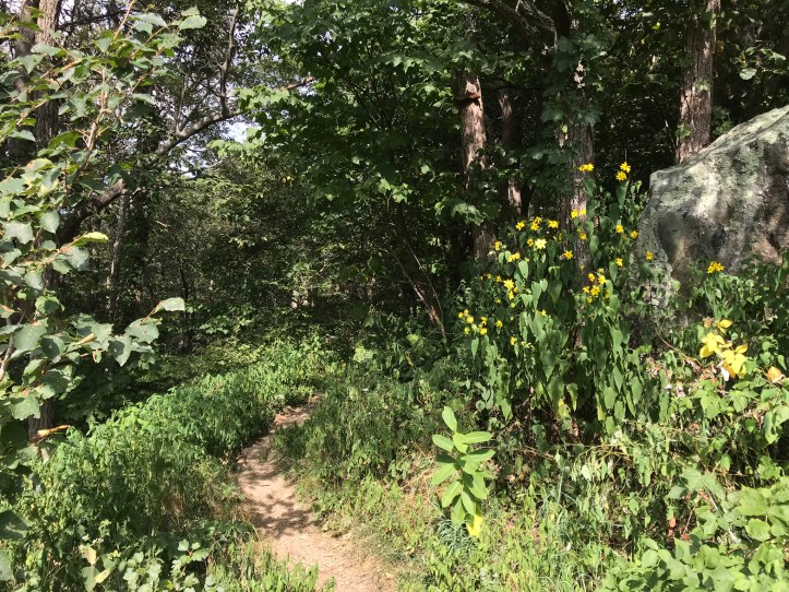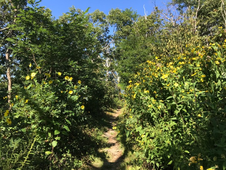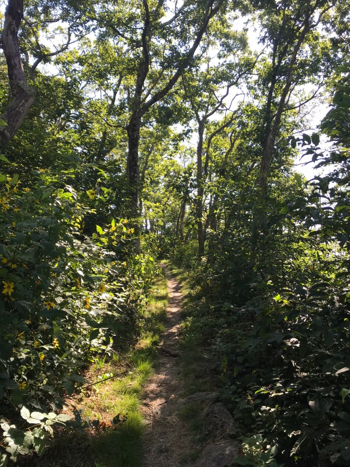 I passed the intersection for Bearfence mountain hut and was grateful that I hadn’t been forced to hike there last night. The trail rose in elevation towards Bearfence Overlook. Happy yellow flowers leaned into the path making for cheerful obstacles.