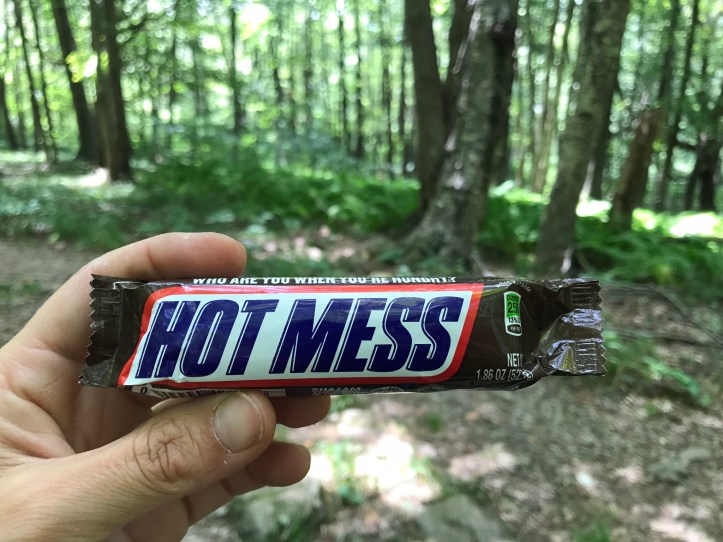 I charged my phone in the bathroom for a few minutes, which made me feel like a woodland troll, but I had no patience for sitting at the dining area outlets. With a smidge of extra juice in my lifeline to Oakland, I packed up my belongings and headed back to the trail. Just past the gas station, I saw a picnic table in a small grassy area. On a whim, I dropped my pack and sat in the shade to have a very unplanned cry about everything that had just happened. A perfect light breeze blew as my head swirled with the pressing weight of humanity. I was nearly done with my journey, and I would soon rejoin the masses in the land of excess and overuse and global warming and general decay of the earth. This snickers bar from the store pretty much sums up my head space: