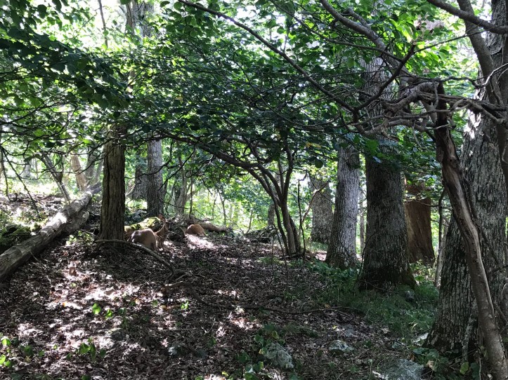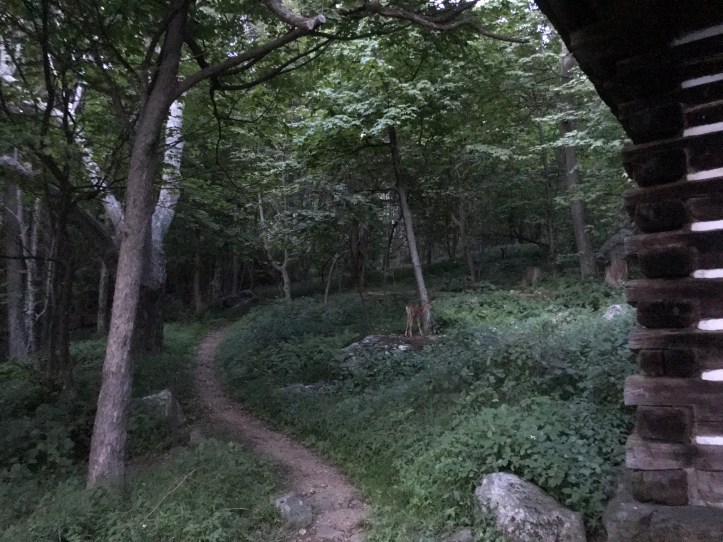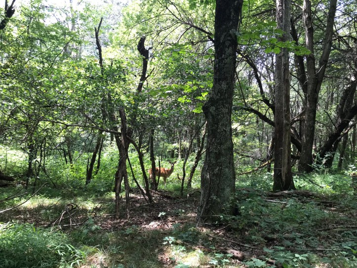 As I walked away, I felt the urge to leave food for it because I wondered how well a 3-legged bear would thrive in the woods, but I knew it was a bad idea because it would habituate the bear to human food more than it might already be. A wave of sadness and anger washed over me as I continued down the trail. There’s no way to know what had made the bear lame, but my doom machine decided it must have been human related. I was pulled out of my rage reverie by a deer standing stock still to the left of the trail. We stared at each other before I moved along.