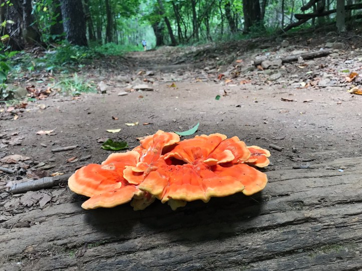 The trail was flat packed dirt that made for easy walking. Another chicken of the woods mushroom glowed like an orange frisbee from a distance.