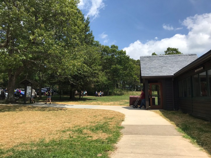 I ducked into the bathroom first and had that familiar zing of excitement when I saw the electrical outlets. I didn’t really need to charge anything, but I noted them just in case. I left my pack by the bathrooms because I felt anxious about leaving it in plain sight with the steady stream of tourists. The lawn and the parking lot felt like they were crawling with people (the following picture doesn’t capture the overstimulation I felt at the time).