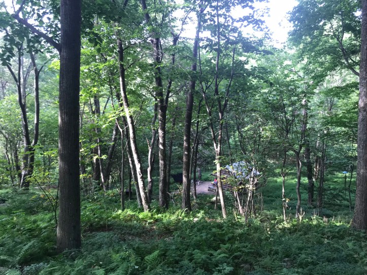 To make matters even worse, I had stubbed my foot three times that morning from exhaustion and distraction. I forced myself to take slow, careful steps as I went uphill towards Hazeltop. The moderation helped reduce the frequency of my foot stabbies. The cicadas finally woke up as I reached the wooded ridge line of Hazeltop. I took a side trail that led to a rocky overlook with a view very similar to the one on Bearfence.
