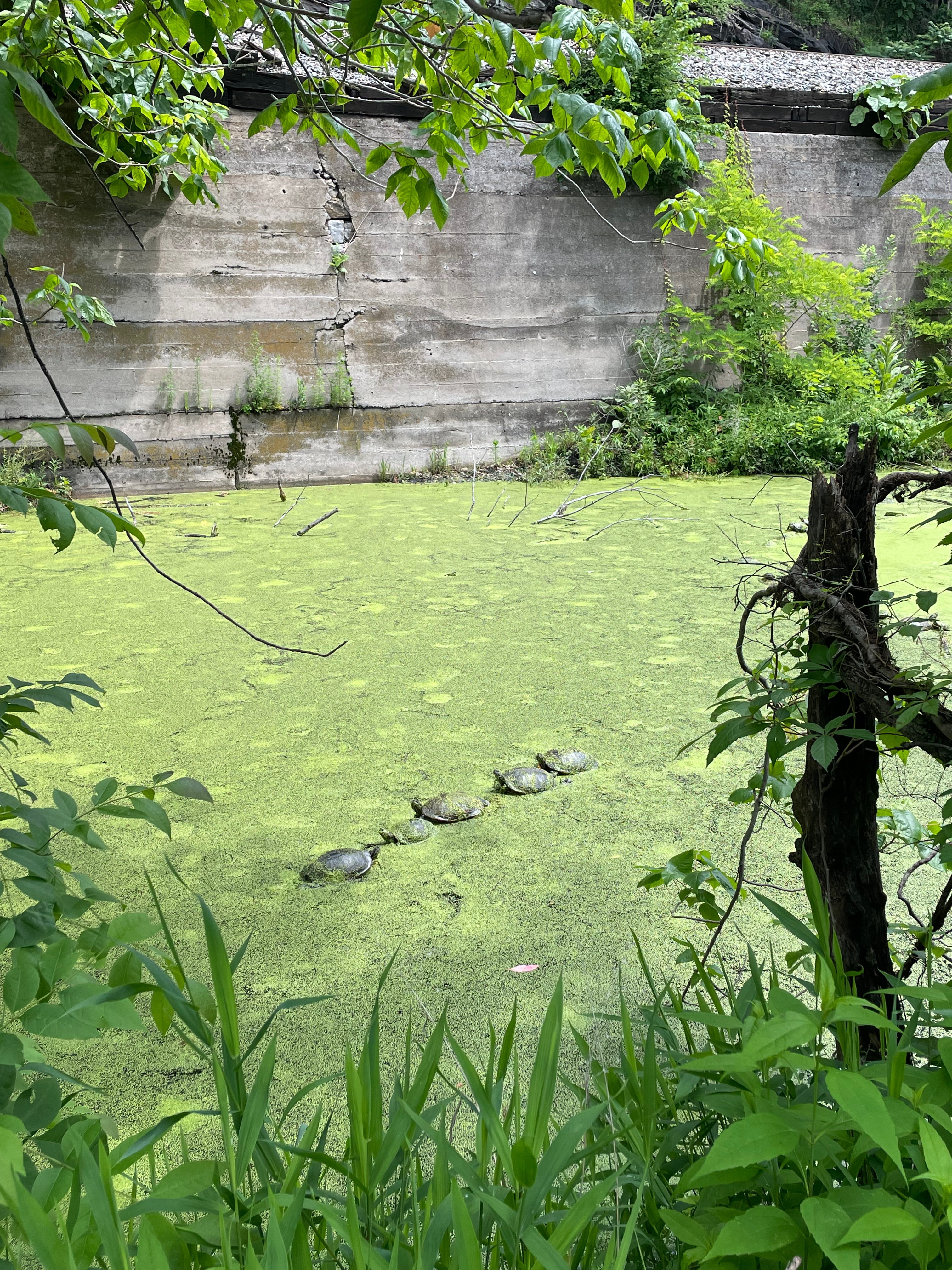 Then came the long walk alongside the river. We had rushing water and highway noise to our right, and a long pool of stagnant water to our right, which was ripe for both mosquitos and turtles. I had my first bites of the hiking season within minutes, but I wasn’t ready to be covered in sunscreen AND deet, so we just weathered the itchiness. Saw many turtles sunbathing and covered in duckweed. Also saw a pedestrian with a parrot on her shoulder, and laughed when the parrot and I both watched each other as we passed.