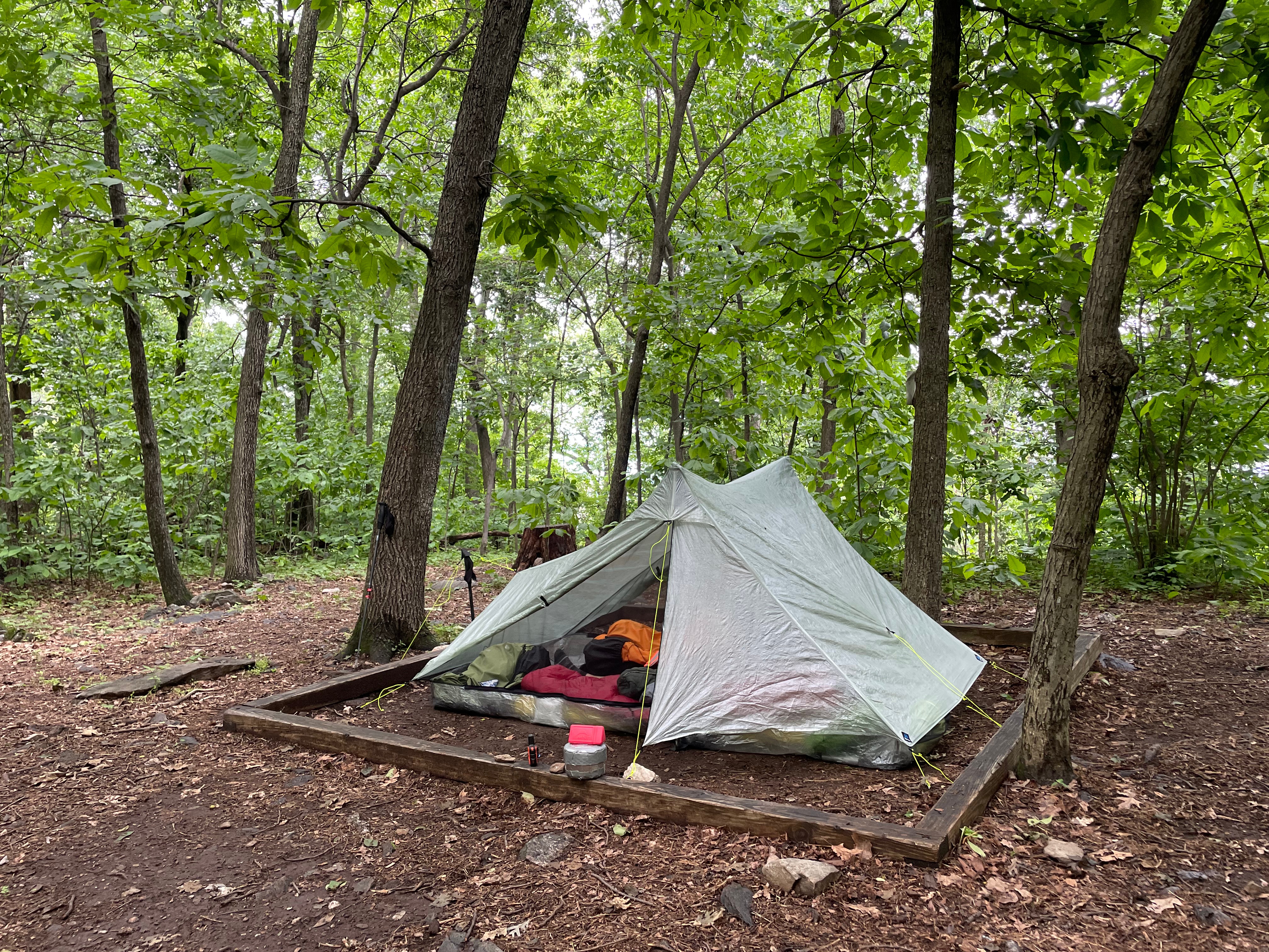 Someone was already at the shelter when we arrived, which put me on edge because it was pretty early to already be set up in a shelter. Said hello, dropped our packs and began the search for a decent tent site. The best one of the mediocre options was tucked into the woods farther than one would hope to be from the privy and had a number of resident worms and slugs, but we made it work.
